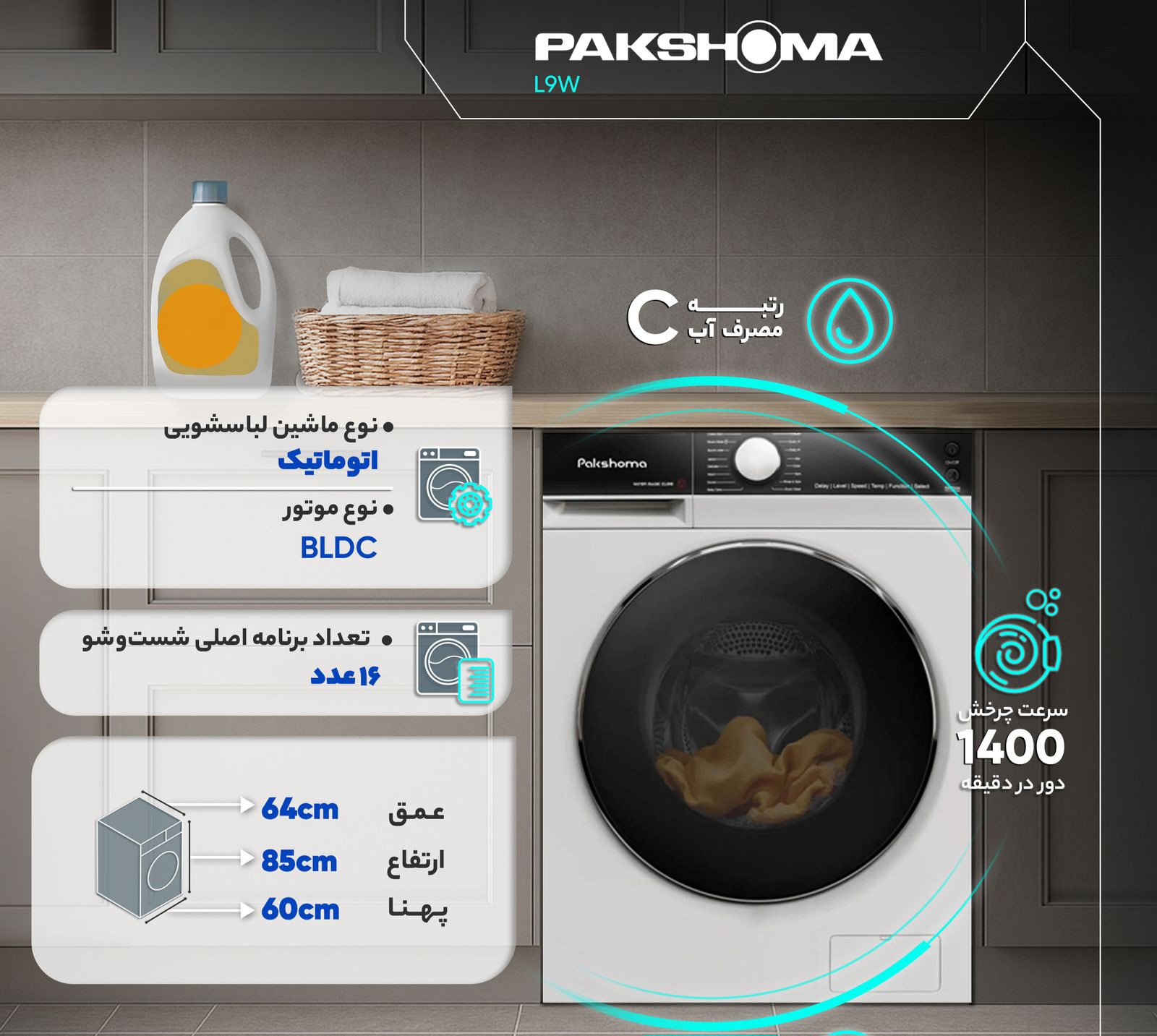 ماشین لباسشویی 9 کیلوگرم اتوماتیک پاکشوما مدل L9W